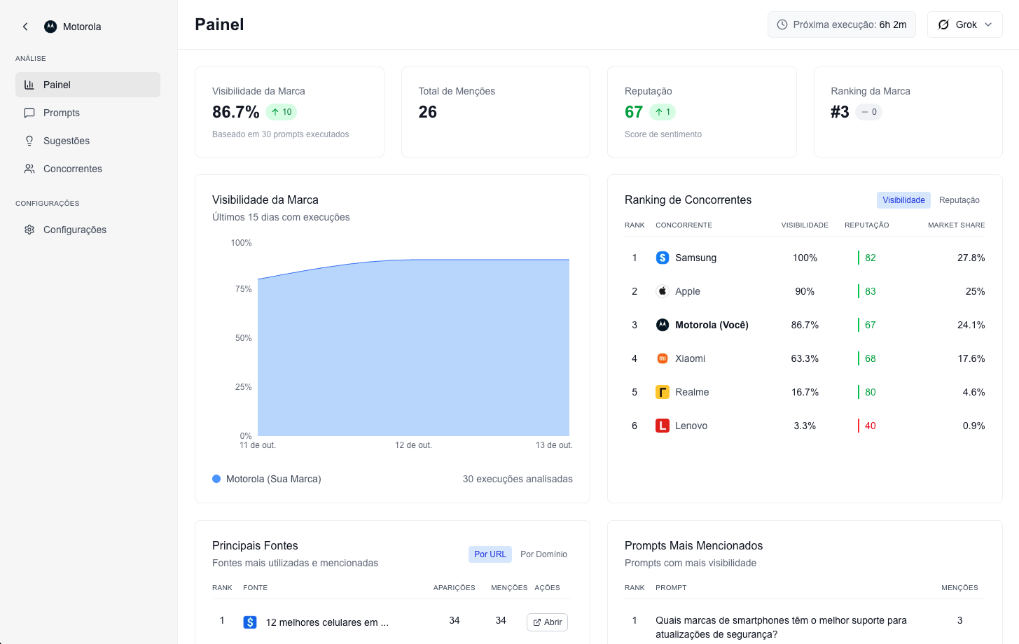Nós monitoramos como sua marca aparece nas respostas de IA (ChatGPT, Gemini, Copilot, Grok, Google AI), rastreando os prompts que você define. Também entregamos insights de visibilidade, reputação, concorrentes e sugestões práticas para você melhorar suas menções e converter esses sinais em vendas.