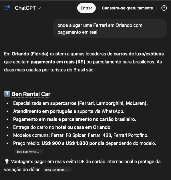 Hoje, quando um brasileiro pergunta ao ChatGPT onde alugar uma Ferrari em Orlando com pagamento em real, a Ben Rental Car aparece como primeira recomendação. Nem sempre foi assim.